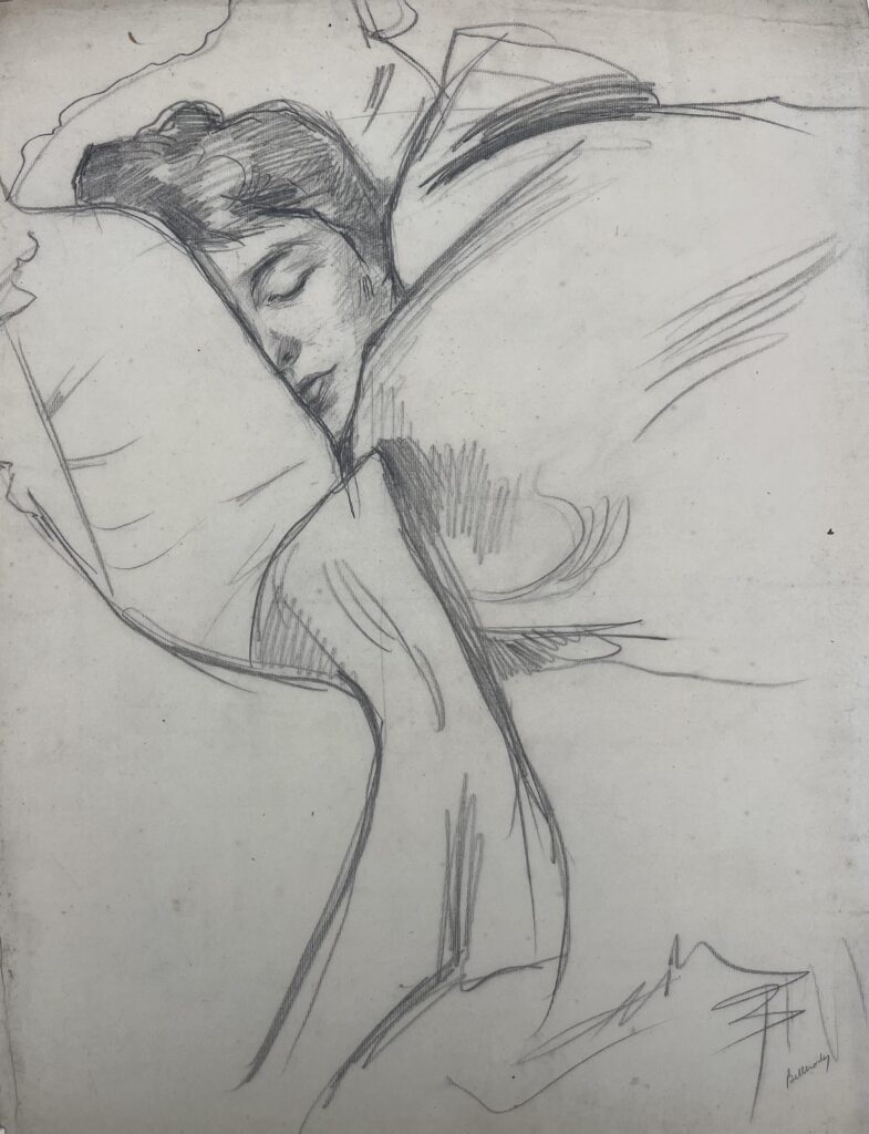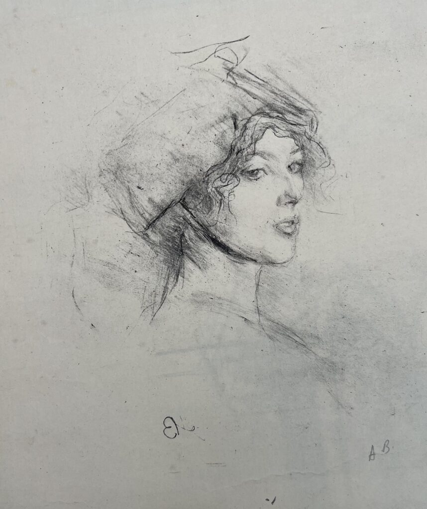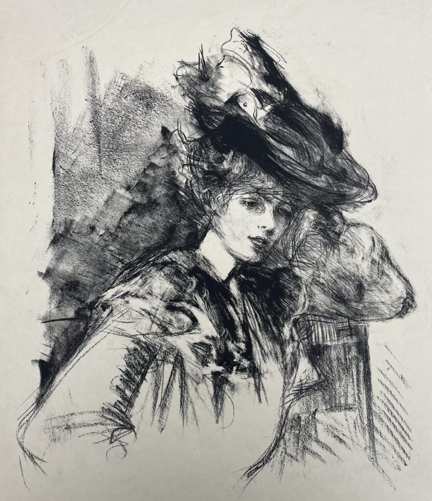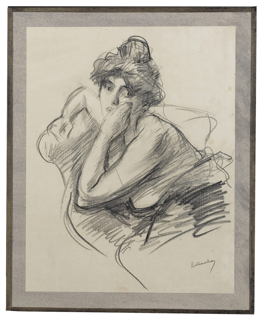 Although born in Wales, he was the son of the Marquis de Belleroche, of one of the most ancient French noble families who, being Huguenots, had fled to England in 1685. In 1871, following the death of his father, he moved back to Paris with his family. After he had finished school there, he studied at the studio of Carolus Duran, and spent long hours copying at the Paris museums. He soon became familiar with the leading painters and intellectuals of the day, and became a founder member of the Salon d’Automne, exhibiting alongside the Impressionists and associating with Emile Zola, Oscar Wilde, Albert Moore, Renoir, Degas, Helleu and Toulouse-Lautrec. Toulouse-Lautrec and Belleroche were exact contemporaries, who first met at the age of eighteen. Belleroche painted Toulouse-Lautrec’s portrait and shared with him a passion for the model Lili, who epitomised the Belle Epoch aesthetic of Toulouse-Lautrec’s most celebrated posters. Lili became Belleroche’s favourite model and mistress. In 1882 Belleroche also met the already acclaimed American painter John Singer Sargent, who recognised Belleroche’s talent and empathised with his free drawing style and sensitivity to light. They became life-long friends. Sargent’s handling of pastel was a great inspiration to Belleroche, while Belleroche’s sensitivity to tone and creation of form through the modeling of light exerted a strong influence on Sargent. In 1900, Belleroche became fascinated by the medium of lithography and by 1905 he was a leading figure in the field of lithographic portraiture. A.M. Hind, a former keeper of prints at the British Museum, described his works in lithography as “amongst the greatest achievements of the craft since its discovery.”