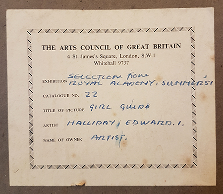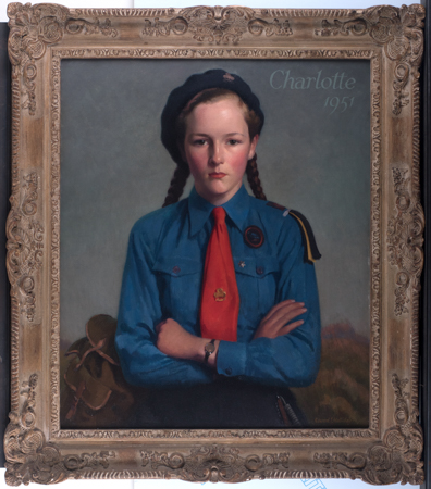 Halliday’s portrait of Charlotte was captured shortly after this period and before the Coronation of Elizabeth II in 1953, who was herself a former guide, and opened an international festival dedicated to the movement. The dress of the sitter reflects uniform common to the group in the 1950’s. Charlotte wears a tunic shirt in headquarters blue’, with a trefoil promise pin affixed to her tie. She wears the traditional beret and shoulder knots, whilst the badge on her chest indicates the patrol group that Charlotte belonged to.