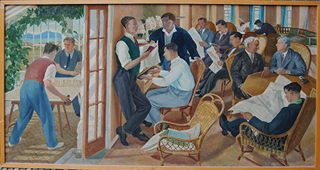 Baker was subsequently given another commission in the early 1930’s, instigated by the powerful political insider Thomas Jones, to paint murals at the Welsh working men’s college, Coleg Harlech, a Workers Educational Association, the largest provider of adult community learning in Wales. The college was  built for George Davison, who was the English agent for Kodak, by his favourite architect George Walton (of Glasgow). It is a rugged form of classicism with fantastic views over Harlech bay.