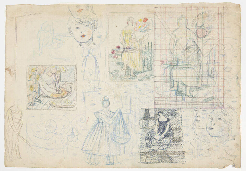 Sheet of unconnected sketches. Pencil, crayon c.1954