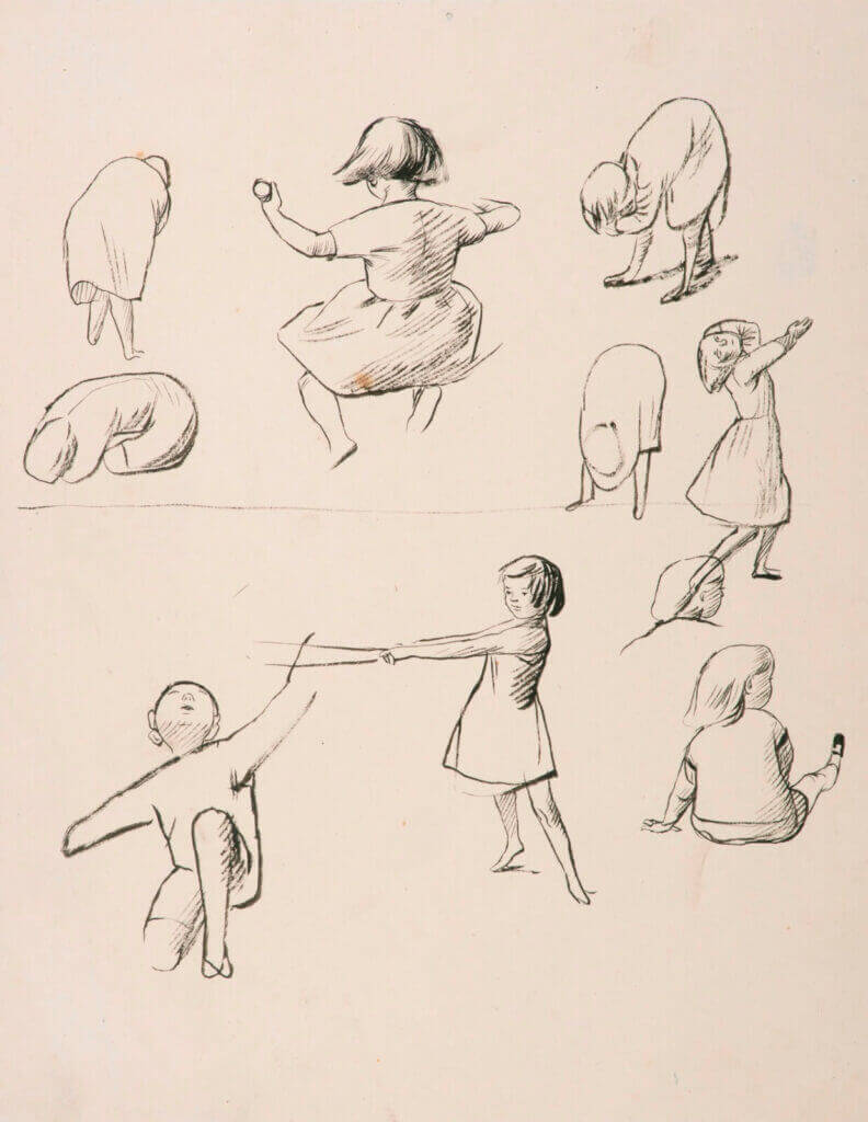 Studies of a seated couple reading scrolls and a woman carrying bowls, mid 1930’s