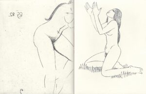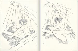 Nine copper plates for the ‘Procreant Hymn’ by E. Powys Mathers, originally published by The Golden Cockerel Press in 1926. In the 1926 publication there were just five illustrations – ‘God Sending’, ‘Earth Waiting’, ‘Earth Inviting’, ‘Dalliance’ and ‘Earth Receiving’. However the publisher included an advertisement for alternative plates available to subscribers individually. These alternative plates follow the composition of the published versions but the male and female figures are presented in a state of realism which would clearly have been unexpected (and, in many quarters, unacceptable) at that time. Our set includes the five published versions as well as the four alternative plates. Plates comprise: -‘God Sending’ (P.359) -‘Earth Waiting’ (P.360) -‘Earth Inviting’ (P.361) – this plate has a second design on the reverse, ‘Yahoo’ (P.411) -‘Dalliance’ (P.362) -‘Earth Receiving’ (P.363) -‘God Sending (Alternative)’ (P.364) -‘Earth Inviting (Alternative)’ (P.365) -‘Earth Wrestling’ (P.366) -‘Earth Receiving (Alternative)’ (P.367)