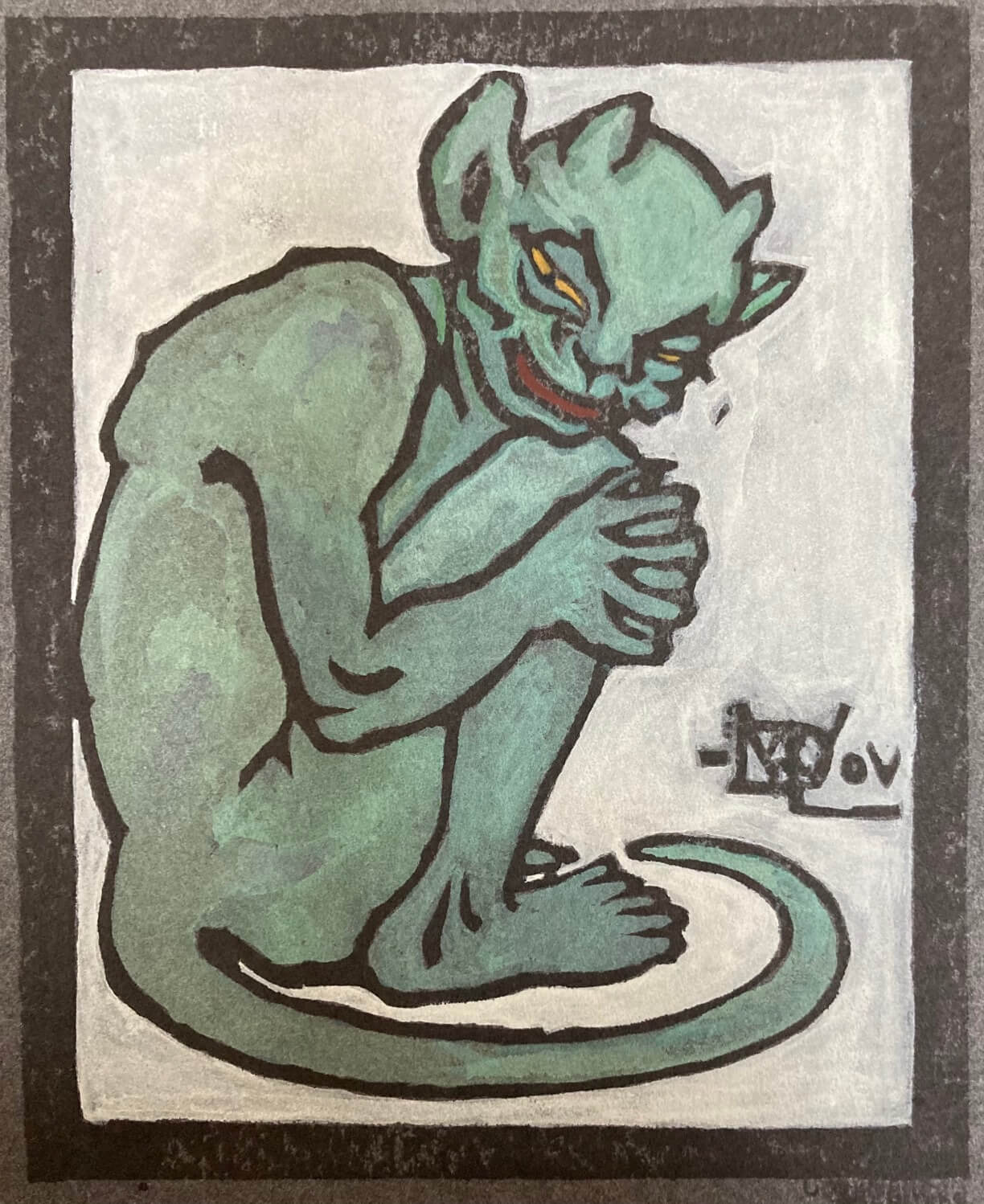 These diminutive devils fascinate because they seem to embody full emotions – from deep outrage to mild distemper, wild surprise to joyful and proud self-regard – with a measure of innocence. These “divers”, androgynous, and sometimes amphibious creatures are never bashful and are in full command of their moments. Their emotionality distinguishes them from the urbane and decadent illustrations of her contemporaries William Strang and Aubrey Beardsley. Like them, Wallace-Dunlop’s imagination did not peddle morality over passion, but unlike their works, Devils in Divers Shapes unapologetically revels in both soulful silliness and emotive energy.