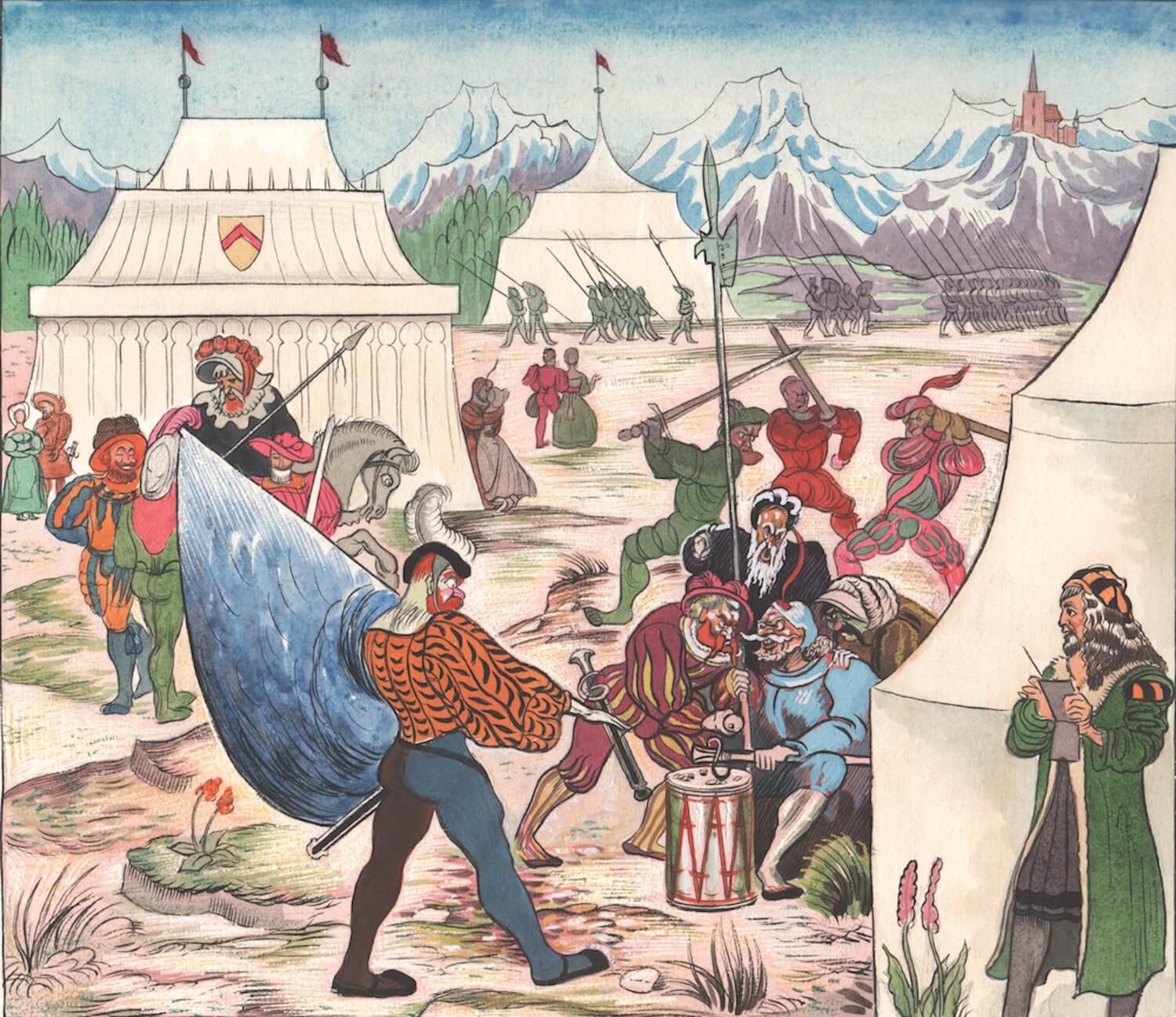 ‘Around the late 1920s Bliss embarked on a decade-long series of comical works based on the Old Masters, which he called Masterpieces in the Making. This combined his erudition, his irreverence, his skill as a watercolourist and his wit as a caricaturist. The scheme was to depict each master in his own style of painting and in his own typical studio setting. So, for example, in Nature Morte, Madame Cézanne sits as still as any apple with her elbow on a tipped-up one-legged table covered in fruit. Her husband concentrates ferociously on his canvas.