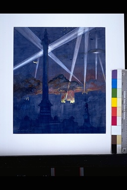 Favouring nighttime views, (illuminated by searchlights, fires and bombs) his pictures are often characterised by a surreal feeling, heightened by the use of shallow perspectives and intense colours.