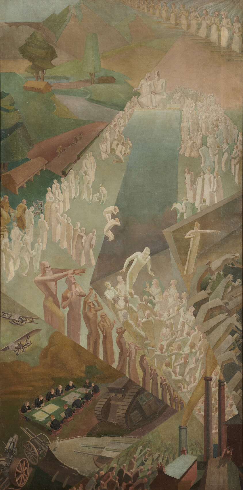 The shape is very distinctive- almost as if this was for a mural scheme; perhaps a Memorial after WW1. If that were the case it is so highly evolved that it might be a proposal or a finished design; possibly one of several panels for a site specific commission. However most permanent memorial sites were pretty orthodox with an emphasis on valour and nationhood, which would make this (proposed?) scheme something out of the ordinary.