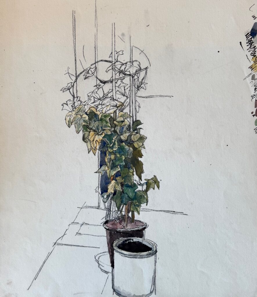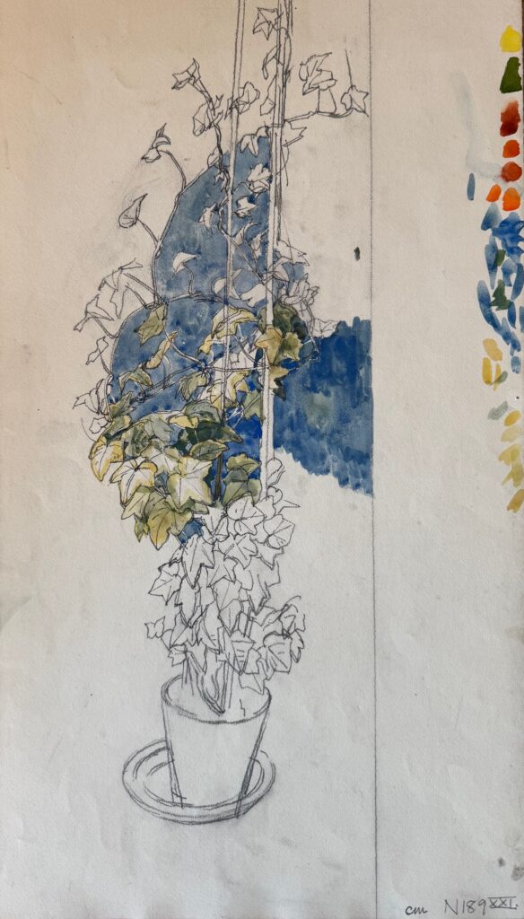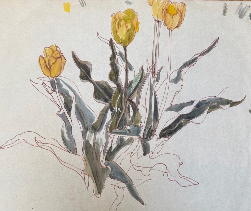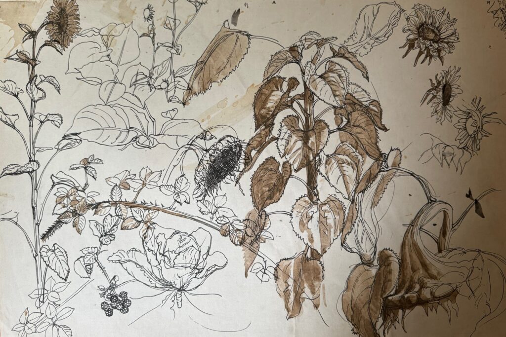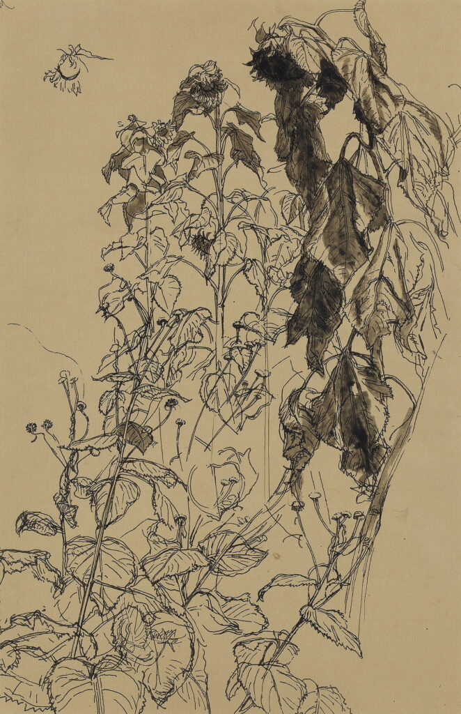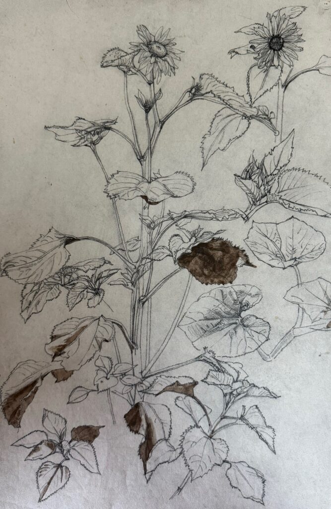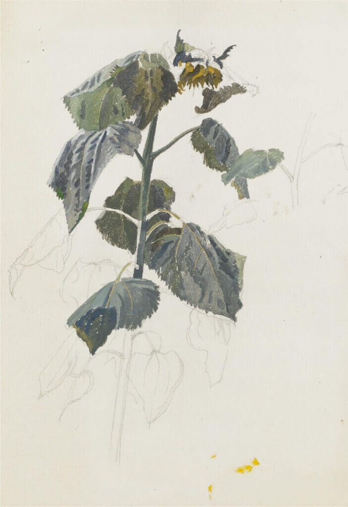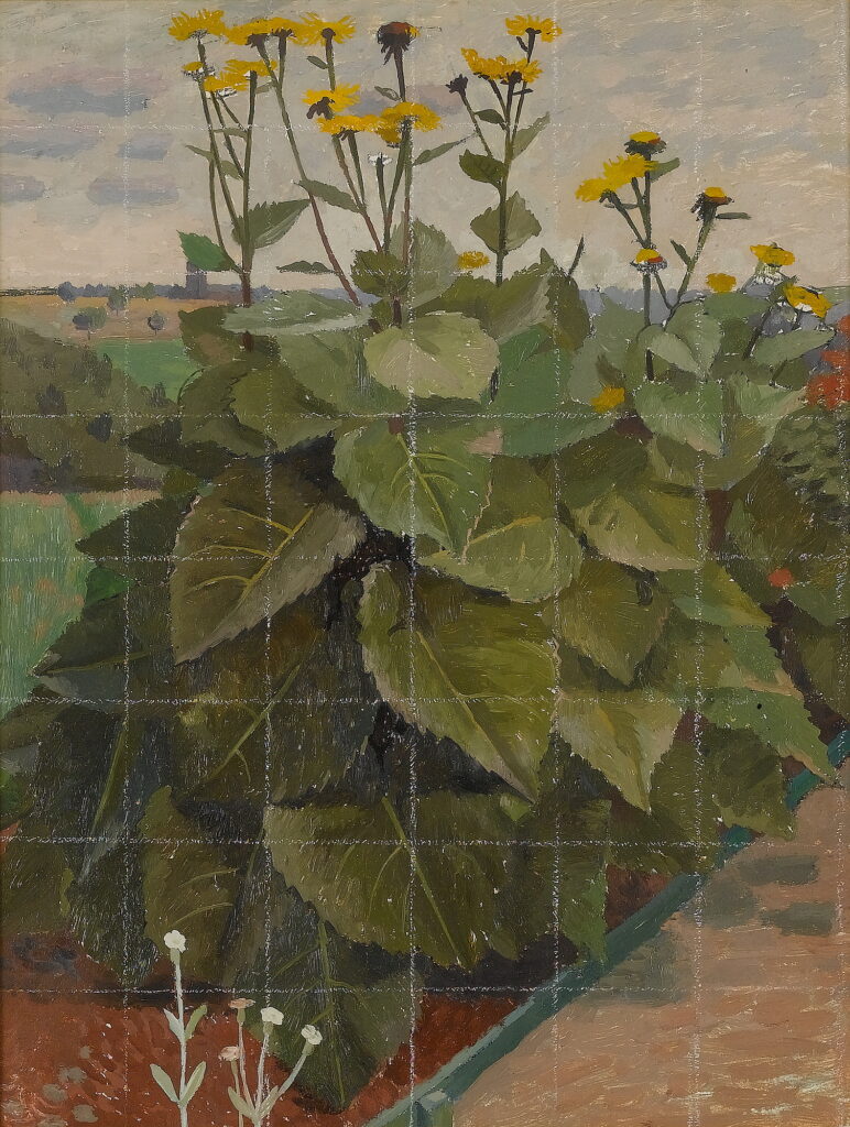 Study of a sunflower in the artist’s garden with rooftops beyond, 1940’s