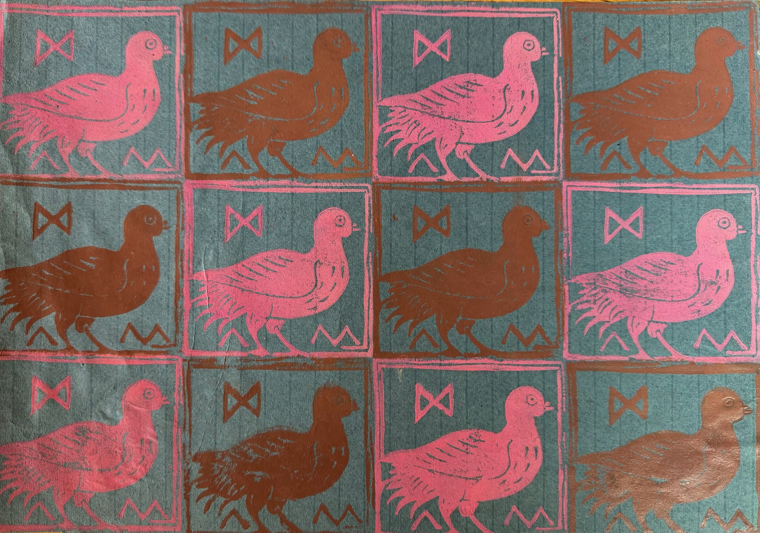In Pigeon Script , Amy Finney explores repetition, rhythm, and the symbolic potential of everyday creatures. Arranged in a stylised grid, each pigeon is framed like a character in an unknown language—part textile, part totem. Finney, often working quietly on the margins of mid-20th-century British art, combines folk craft with modernist clarity, using a precise linocut technique to lend boldness and texture to her work. The recurring motifs evoke both ancient runes and contemporary design, reflecting her interest in the ways pattern can carry meaning across time. The symbol in the image, which looks like an angular hourglass resembles the ᛞ rune (called Dagaz) from the runic alphabet used in Germanic languages before the Latin script became dominant. It means; day, dawn, or awakening and symbolises; transformation, enlightenment, new beginnings, and clarity.