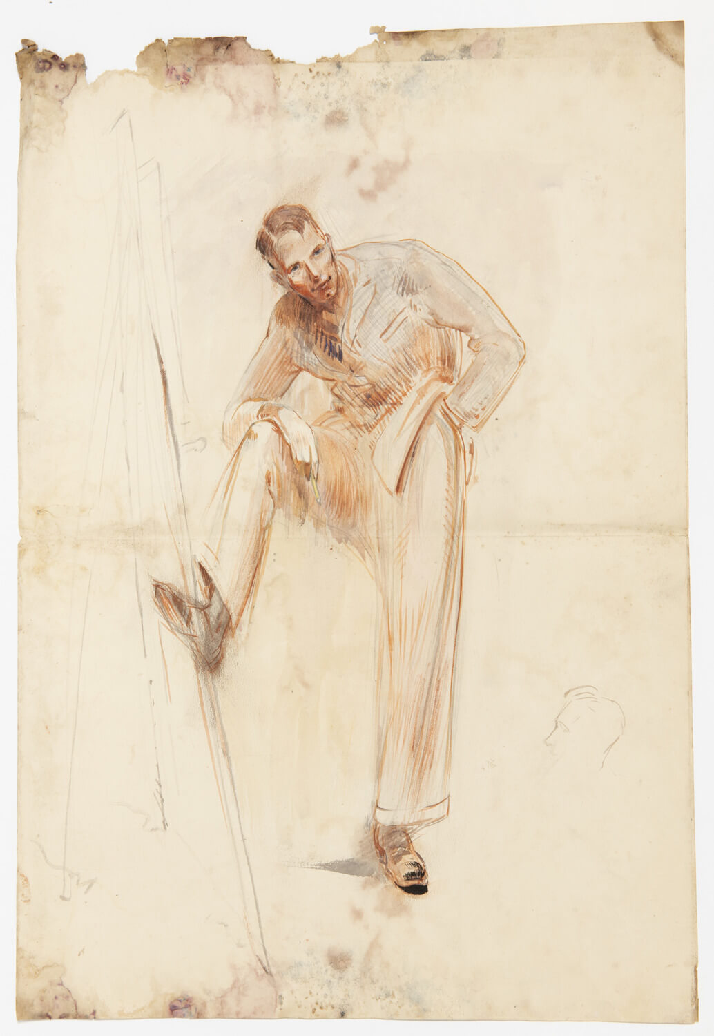 The identity of this artist, with his foot resting nonchalantly on the easel, is thought to be Robert Lyon who was a student at the Royal College of Art in the mid 1920’s.