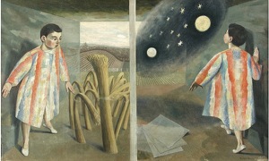Biblical illustration, particularly of subjects from Genesis, is a fairly common theme in Dunbar’s work. Here Joseph, the favourite son of his father Jacob, is experiencing two dreams. On the left, sheaves of wheat representing his parents and his 11 older brothers, are about to bow down before him. On the right, the sun and moon and 11 stars symbolise the same obeisance. He became deeply unpopular within his family, but eventually the dreams turned out to be well founded. The finished Joseph’s Dream became the first in Dunbar’s Joseph trilogy, the others being Joseph in the Pit and Joseph in Prison.
