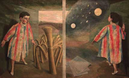The story of Joseph and his dreams, as told in Genesis, chapter 37ff., was Dunbar’s inspiration for several paintings illustrating his life. The left panel of the dyptych shows sheaves of corn bowing down in homage before Joseph.The right panel depicts the sun, moon and stars, representing Joseph’s parents and brothers, doing the same.