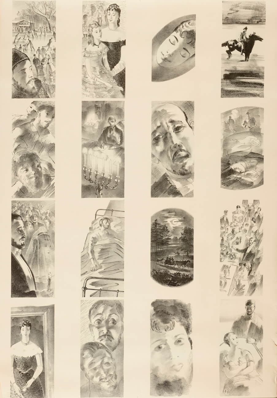 This is a test sheet, without colour, of the proof book illustration for Tolstoy’s Anna Karenina, Cambridge University Press, 1951  – one of Freedman’s most accomplished achievements in the field of book illustration.  Issued as part of the Limited Editions Club in 1951 the publication comprised two volumes bound in cloth decorated with lithographic drawings by Barnett Freedman drawn on and printed from a phenominal 225 stones, printed  at the Curwen Press.