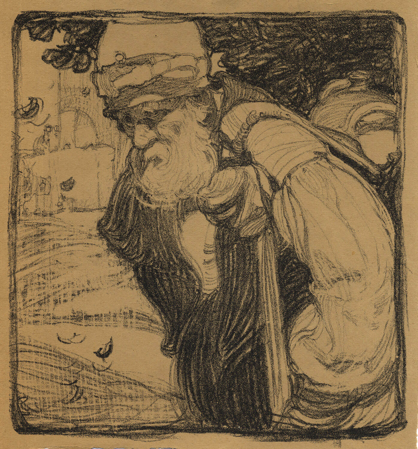 Frank Brangwyn was born in Bruges, Belgium, the son of an English father and Welsh mother. The family returned to London in 1874, Brangwyn’s father gaining work as a designer of buildings, embroideries and furniture. Although Brangwyn appears to have had little formal education, whether academic or artistic, his earliest mentors were three of the most influential men in design at the turn of the century: Arthur Heygate Mackmurdo, William Morris and Siegfried Bing. Between 1884 and 1887 Brangwyn travelled to Kent, Cornwall and Devon, before venturing further with trips to Turkey in 1888, South Africa in 1891, Spain in 1892 and Morocco in 1893.