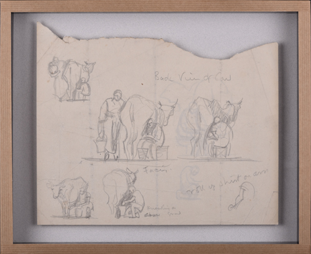 Brangwyn was an independent artist, an experimenter and innovator, capable of working on both large and small scale projects, ranging from murals, oil paintings, watercolours, etchings, woodcuts and lithographs to designs for architecture, interiors, stained glass, furniture, carpets, ceramics and jewellery, as well as book illustrations, bookplates and commercial posters. It is estimated that he produced over 12,000 works during his lifetime. Mural commissions included the Worshipful Company of Skinners, London (1902-09), St Aidan’s church, Leeds (1908-16), Manitoba Legislative Building, Winnipeg, Canada (1918-21), Christ’s Hospital, Horsham (1912-23), State Capitol, Jefferson City, USA (1915-25), the British Empire panels, Swansea (1925-32), and Rockefeller Center, New York (1930-34). Brangwyn married Lucy Ray in 1896 and took on the lease of Temple Lodge, Hammersmith, in 1900. In 1918 the artist purchased The Jointure, Ditchling, where he spent most of his time following his wife’s death in 1924. Elected RA in 1919, knighted in 1924, holder of countless artistic awards, Brangwyn was modest about his singular achievements, regarding art as an occupation and describing himself as a designer.