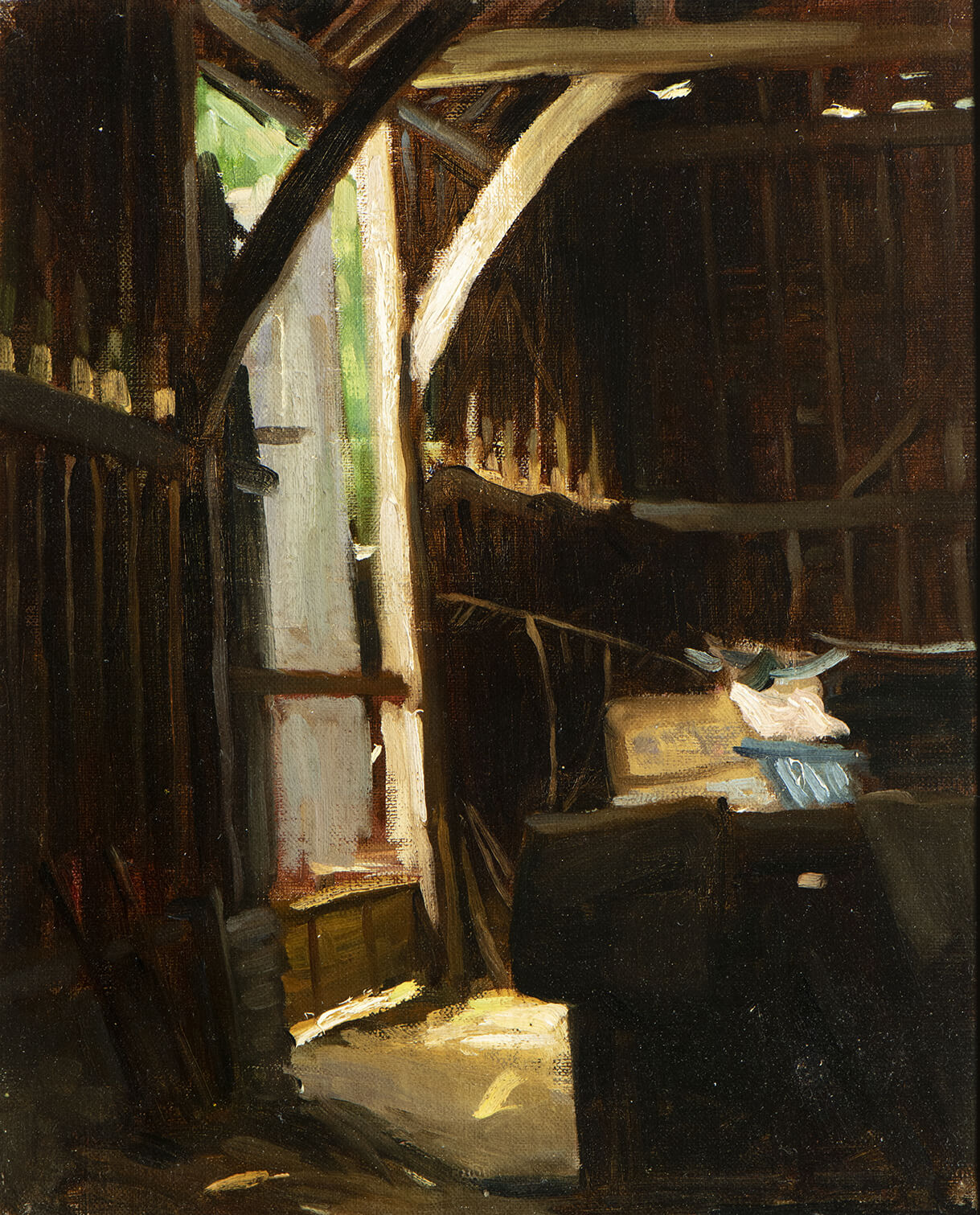 Jowett frequently worked in situ – this timber barn serving briefly as an impromptu studio.