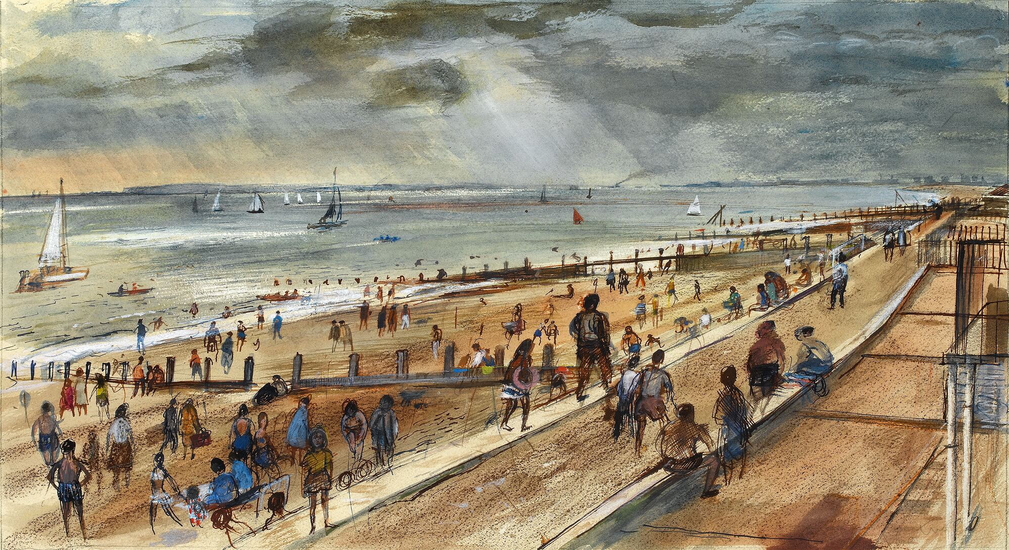 Another aspect of Sorrell’s oeuvre which deserves greater recognition are the paintings he produced during WW2. Like many artists of the period, such as Sir Thomas Monnington, Sorrell’s direct experience as an airman resulted in a new perspective ‘ broad horizons and tilted aerial views which were to become the hallmark of his post-war reconstruction drawings. Never an Official War Artist he was able to choose his subjects with relative freedom which resulted in an engaging record of daily life in wartime Britain.