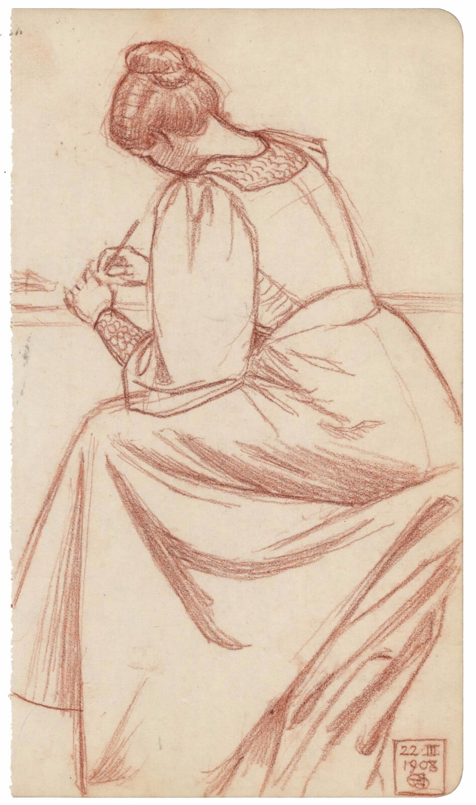 Bessie was a gilder and the creator of Joseph Southalls frames. This possibly shows her at work on a frame, incising ornament into the gesso before gilding.