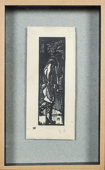 Brangwyn was an independent artist, an experimenter and innovator, capable of working on both large and small scale projects, ranging from murals, oil paintings, watercolours, etchings, woodcuts and lithographs to designs for architecture, interiors, stained glass, furniture, carpets, ceramics and jewellery, as well as book illustrations, bookplates and commercial posters. It is estimated that he produced over 12,000 works during his lifetime. Mural commissions included the Worshipful Company of Skinners, London (1902-09), St Aidan’s church, Leeds (1908-16), Manitoba Legislative Building, Winnipeg, Canada (1918-21), Christ’s Hospital, Horsham (1912-23), State Capitol, Jefferson City, USA (1915-25), the British Empire panels, Swansea (1925-32), and Rockefeller Center, New York (1930-34). Brangwyn married Lucy Ray in 1896 and took on the lease of Temple Lodge, Hammersmith, in 1900. In 1918 the artist purchased The Jointure, Ditchling, where he spent most of his time following his wife’s death in 1924. Elected RA in 1919, knighted in 1924, holder of countless artistic awards, Brangwyn was modest about his singular achievements, regarding art as an occupation and describing himself as a designer.