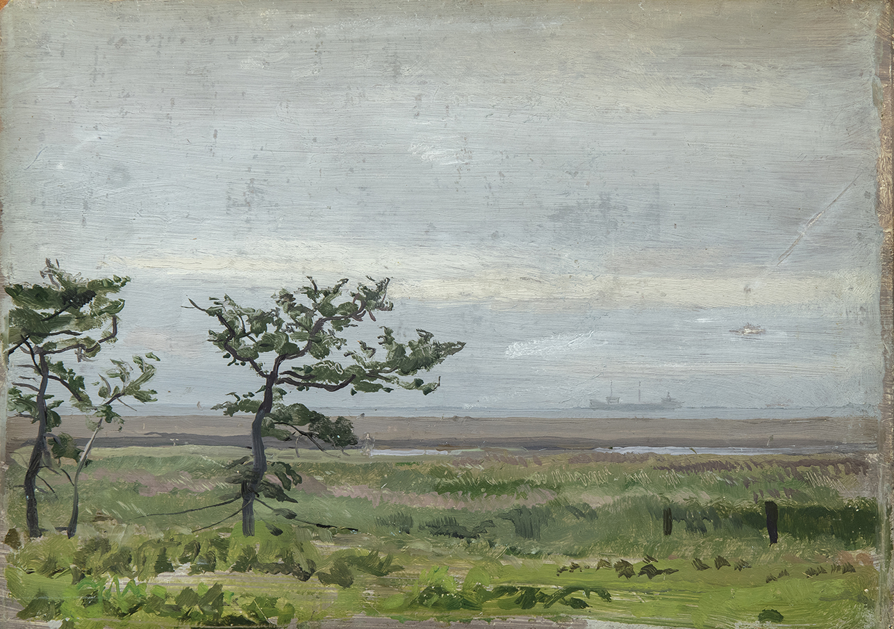At the outbreak of the Second World War, Stephen Bone enlisted as an officier in the Civil Defence Camouflage Establishment based in Leamington Spa. In June 1943 Bone was appointed by the War Artists’ Advisory Committee to be a full-time salaried artist to the Ministry of Information specialising in Admiralty subjects. The post had originally being held by Stephens father, Muirhead Bone, but following the death of Gavin Bone, Stephens brother, Muirhead decided not to continue with the commission. Stephen produced a large quantity of works showing naval craft and coastal installations around Great Britain. He recorded the 1944 Normandy landings, painted scenes in Caen and Courseulles after the invasion and went on to record the assault on Walcheren Island in the Netherlands. Towards the end of 1944 he travelled to Norway and painted the wreck of the Tirpitz.