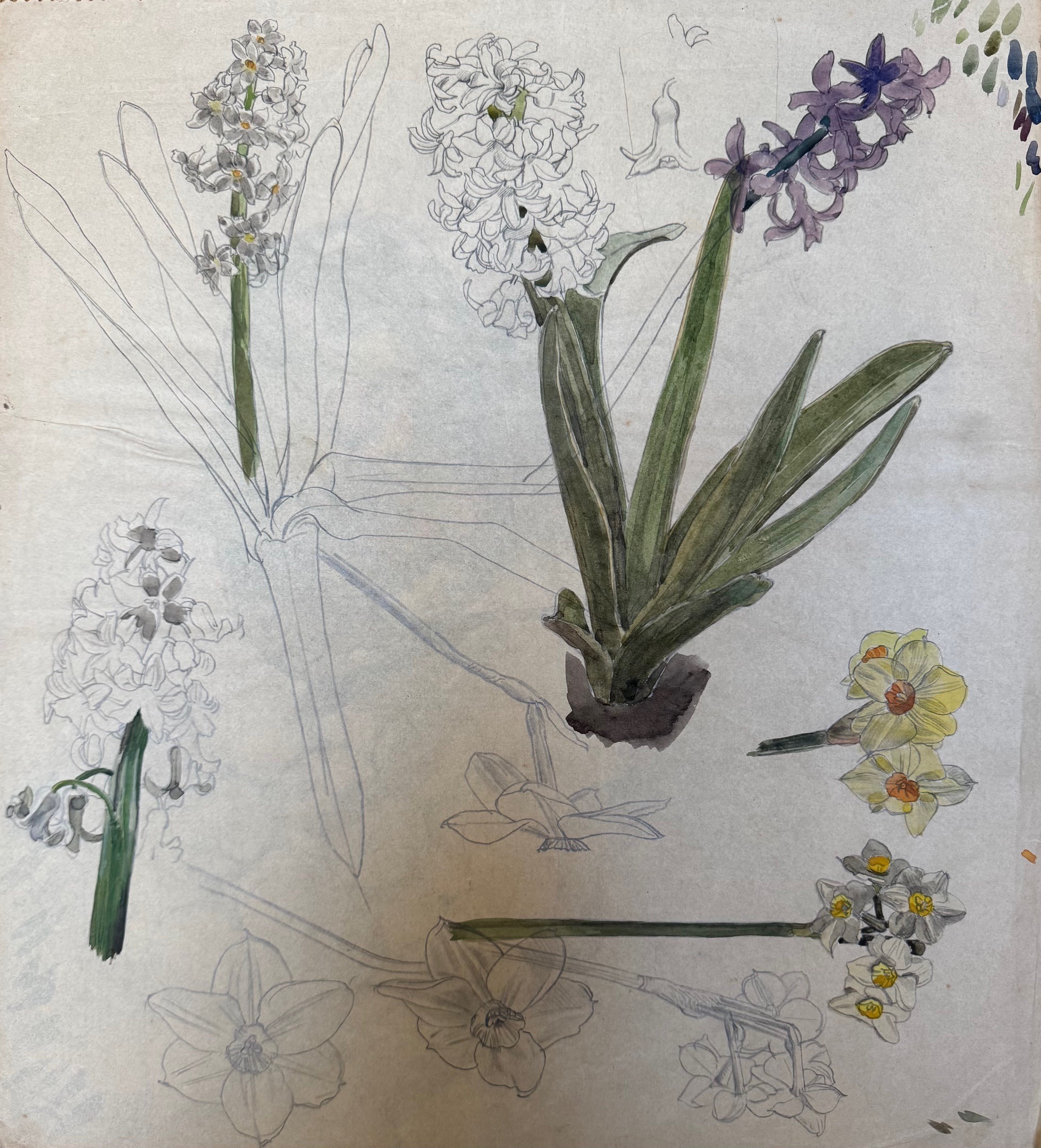 Botanical study of hyacinths and narcissus (daffodils/jonquils).