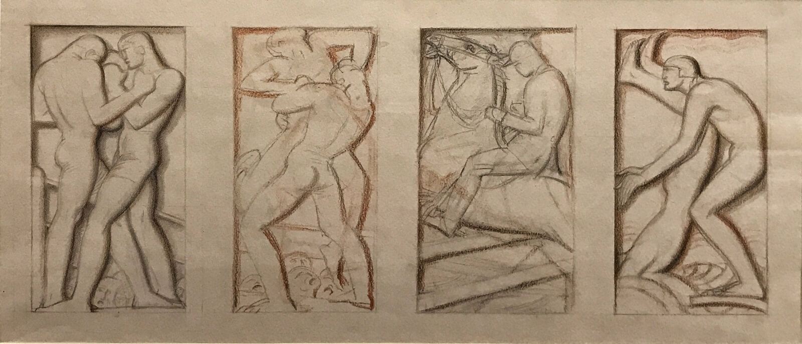 While other artists pioneered the development of modern sculpture, ultimately towards the abstract, Ledward’s work remained figurative. In 1934, he co-founded the firm Sculptured Memorials and Headstones in an attempt to promote carving by regional artists in native stone. He made architectural sculpture for many major buildings in the capital. He was Professor of Sculpture at the Royal College of Art, 1926-29, Henry Moore being his studio assistant. Elected to the Royal Academy in 1937 he was also President of the RBS 1954-56 and a member of the Art Workers’ Guild. His works are in the collections of the RA and the Tate Gallery. A memorial exhibition of his work was held at Stoke-on-Trent Art Gallery in 1961. His Sloane Square Fountain, unveiled in 1953 showed his deco-inflected classicism still flourishing. His last major work was the colossal stone relief, entitled Vision and Imagination, completed in 1961 after his death, for Goodenough House in Old Broad Street in the City of London. It has since been removed to St. George’s Hospital, Tooting. He was awarded an OBE in 1956 and a centenary tribute to Ledward was staged at the FAS in 1988.