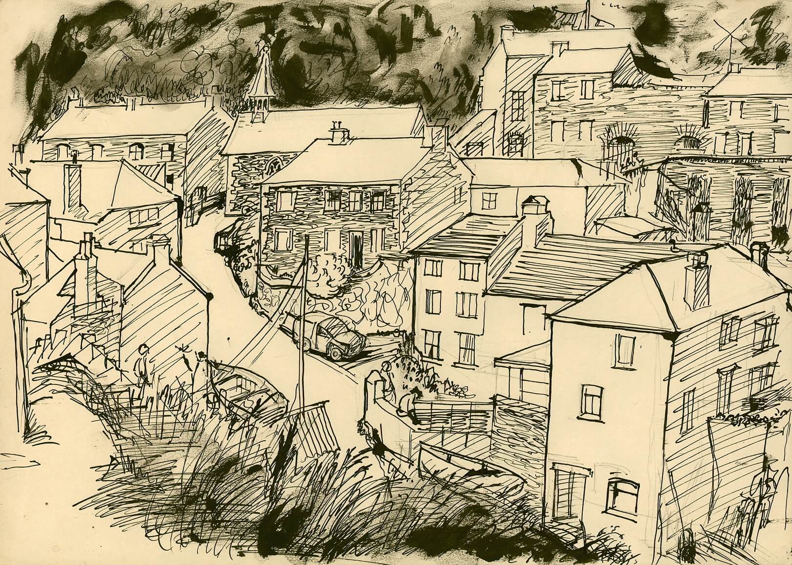 Watercolourist, illustrator, designer, printmaker and teacher, born in Braintree, Essex, the county in which he spent much of his life, finally living in Saffron Walden. Studied at Cambridge School of Art from 1919, then at Royal College of Art, 1922-5, on a scholarship, in the design school being taught by Paul Nash. Soon began on commercial work for Poole Pottery and Curwen Press, then in 1928-9 with Eric Ravilious and Charles Mahoney did decorations for Morley College. Bawden went on studying engraving and bookbinding at Central School Arts and Crafts after leaving the Royal College and himself taught there, the Royal Academy Schools and Goldsmith’s College School of Art. First one-man show at Zwemmer Gallery in 1934, after which he showed extensively including RA, being elected RA in 1956. Work poured from Bawden’s studio in the 1930s for companies such as Shell-Mex; book illustrations such as Good Food, 1932, and The Week-end Book, 1939; and a mass of often ephemeral work which evinced a wonderful wit, economy and aptness to subject. Official War Artist in World War II, much of his output being in the Imperial War Museum. Tate Gallery and many other public collections hold his work. Bawden did decorations for the ships Orcades and Oronsay and for the Unicorn Pavilion for the Festival of Britain of 1951. His son was the artist Richard Bawden. Restrospective at Victoria & Albert Museum in 1989, a tribute at Fine Art Society in 1992, a design retrospective at Rye Art Gallery, Rye, 1999, and Fine Art Society and Guildhall Library centenary celebrations in 2003.
