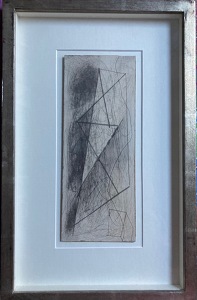 Framed in a silvered shadow box with broad bevelled slip,  non reflective museum glass.