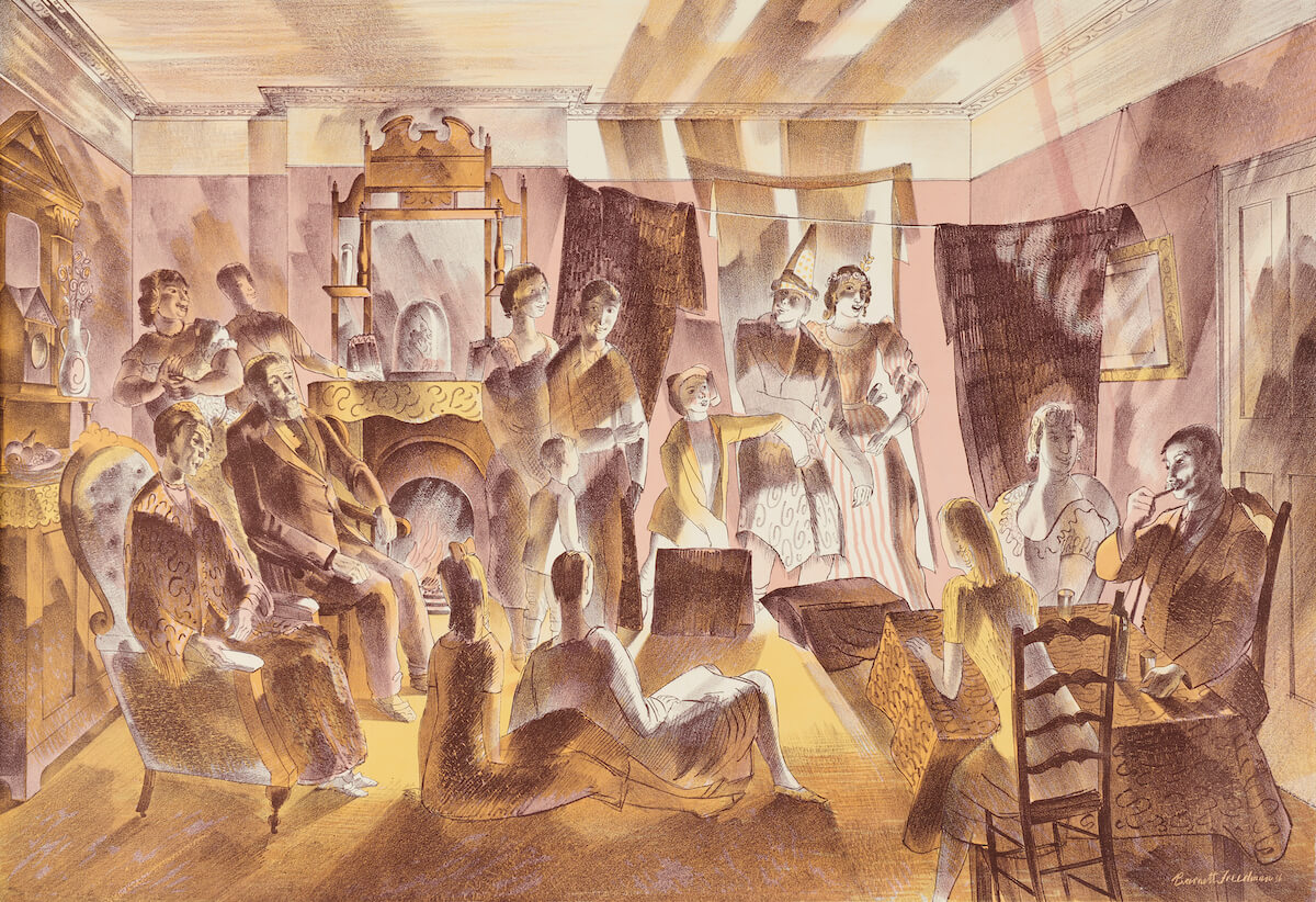 Concerning Barnett Freedman’s Charade, Ruth Artmonsky writes that Freedman’s lithograph is reminiscent of the many Christmas cards he produced showing convivial social scenes. These were usually small vignettes which he has worked up into a full-blown party for his lithograph. His total command of the medium comes across in his subtle colour combinations with the play of the firelight’.