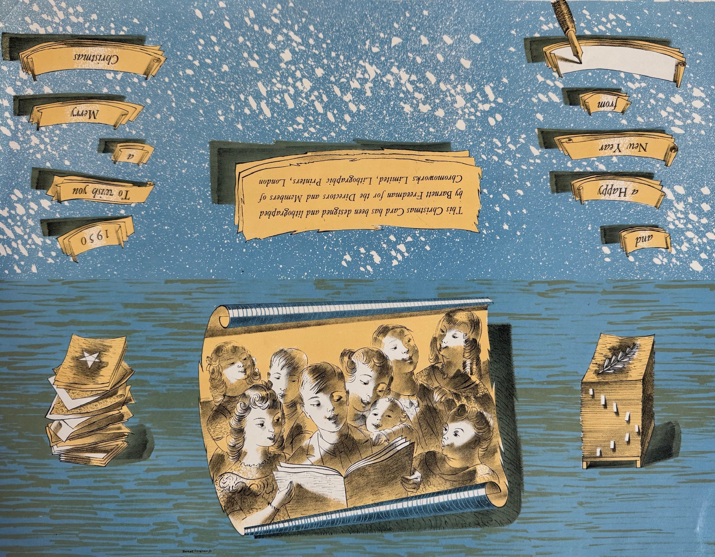Illustrator, painter, printmaker and teacher, Freedman was born to Russian Jewish immigrants living in poverty in the East End of London. In 1916, he worked as draughtsman to a monumental mason, and at the same time took evening classes at St Martin’s School of Art. In 1922, he won a three-year scholarship to the Royal College of Art. In 1928, he joined the staff of the Royal College, and not long afterwards began to teach at the Ruskin School of Art, Oxford. He soon became a pioneer in the revival of colour lithography. He was an Official War Artist in World War II. By the time of his death Freedman had established an enviable reputation as an illustrator and designer of posters, stamps, books and book-jackets. He believed that there was no such thing as commercial art, ‘only good art and bad art’. His first exhibition was held in 1929 at the Literary Bookshop, Bloomsbury. A memorial exhibition was organised by the Arts Council in 1958. Manchester Polytechnic, which holds the Freedman archive, held a major show in 1990. Examples of his work are in the collection of the Tate Gallery.