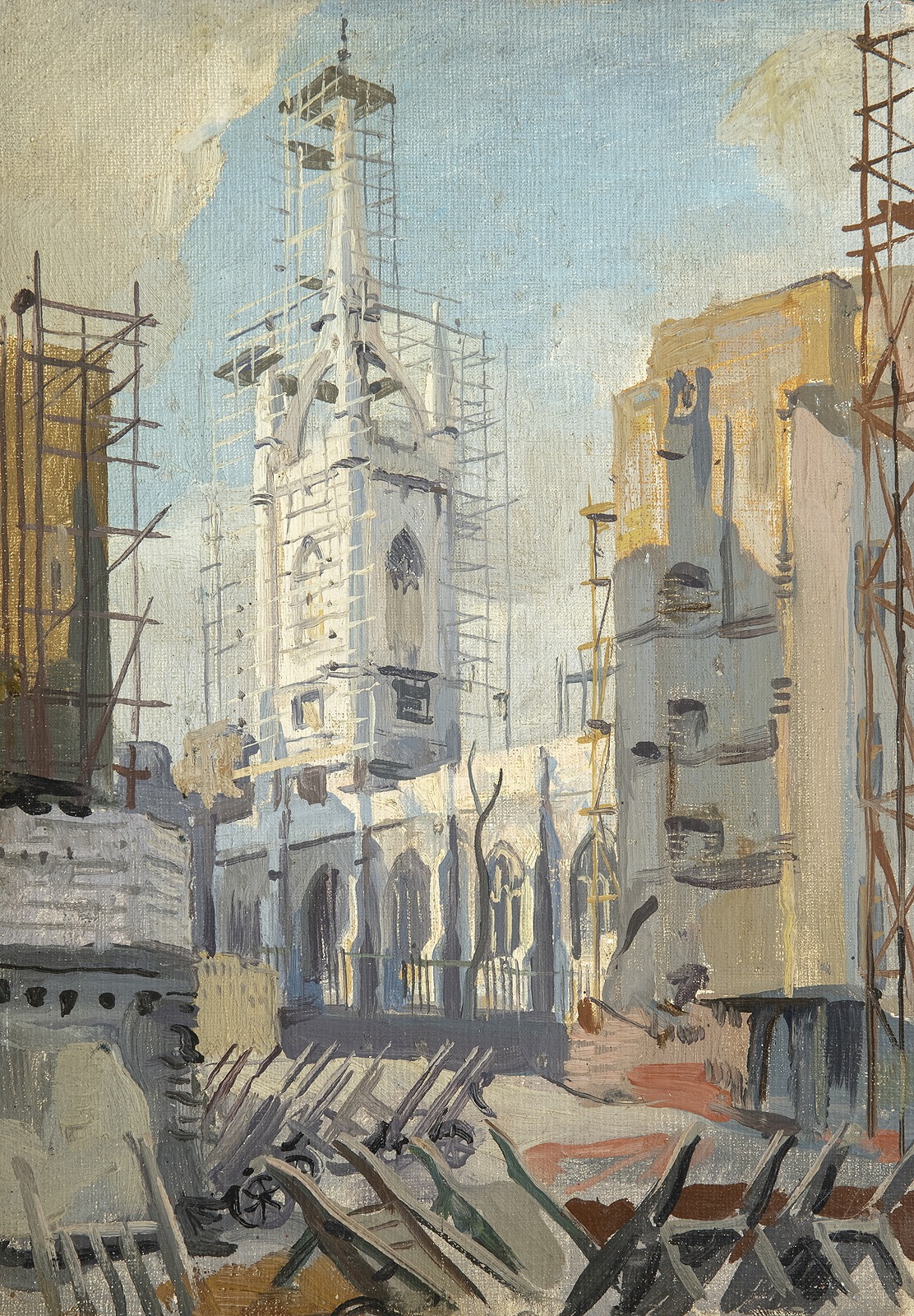 After the War, Bone found his style of painting somewhat out of fashion and, although he continued to paint, he found it difficult to get his work exhibited. He became an art critic for the Manchester Guardian, wrote humorous pieces for the Glasgow Herald and did television and radio work for the BBC. With his wife, he wrote and illustrated children’s books. He died of cancer on 15 September 1958 at St Bartholomew’s Hospital, London.