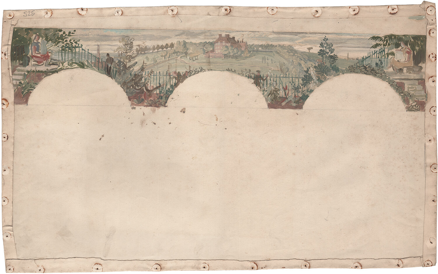 Exhibited: Evelyn Dunbar – The Lost Works, Pallant House Gallery, October 2015 – February 2016, cat 19. Literature: Evelyn Dunbar – The Lost Works, eds Sacha Llewellyn & Paul Liss, July 2015, cat. 19, page 52; Evelyn Dunbar: A Life in Painting, Christopher Campbell-Howes, October 2016, pages 93-168. The chosen theme for the hall panels was Aesop’s Fables, which gave scope for narrative themes in landscape settings. Having completed The Country Girl and the Pail of Milk, one of the five large arched panels, Dunbar turned her attention to the enclosed balcony and the possibility of painting a frieze along its 12 metre length. After several experiments in proportion she produced a panorama of Hilly Fields, the area surrounding the school, composing a visual encyclopedia of 1930s suburbia with the foreground featuring the mostly innocent activities of Brockley schoolboys on their way home from school. Dunbar’s initial water-colour sketchwork was made from the top of a nearby water-tower, in which she was wedged between the water tank and a tiny dormer window; interviewed by The Kent Messenger in 1935 she remembered that in this cramped space in the summer heat of 1933 the water in her paint jar nearly boiled’.