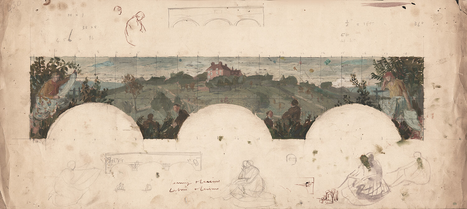 Exhibited: Evelyn Dunbar – The Lost Works, Pallant House Gallery, October 2015 – February 2016, cat 19. Literature: Evelyn Dunbar – The Lost Works, eds Sacha Llewellyn & Paul Liss, July 2015, cat. 19, page 52; Evelyn Dunbar: A Life in Painting, Christopher Campbell-Howes, October 2016, pages 93-168. The chosen theme for the hall panels was Aesop’s Fables, which gave scope for narrative themes in landscape settings. Having completed The Country Girl and the Pail of Milk, one of the five large arched panels, Dunbar turned her attention to the enclosed balcony and the possibility of painting a frieze along its 12 metre length. After several experiments in proportion she produced a panorama of Hilly Fields, the area surrounding the school, composing a visual encyclopedia of 1930s suburbia with the foreground featuring the mostly innocent activities of Brockley schoolboys on their way home from school. Dunbar’s initial water-colour sketchwork was made from the top of a nearby water-tower, in which she was wedged between the water tank and a tiny dormer window; interviewed by The Kent Messenger in 1935 she remembered that in this cramped space in the summer heat of 1933 the water in her paint jar nearly boiled’.
