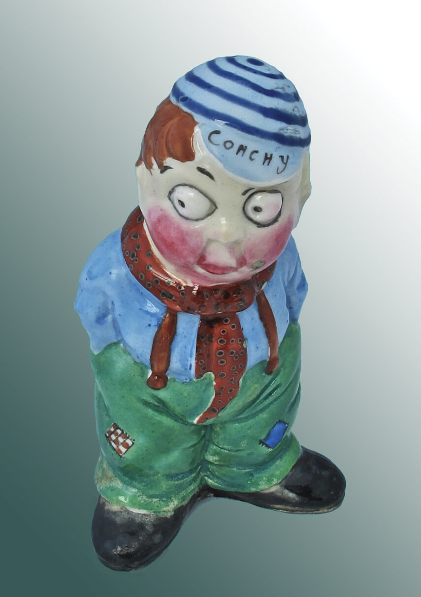 An extremely rare hand-painted Savoy china (Birks Grotesques) First World War “Conchy.” A Chloe Preston peek-a-boo character.