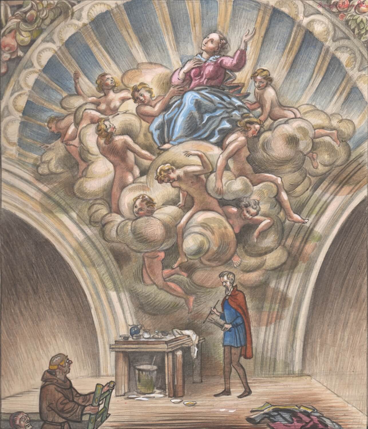 ‘Around the late 1920s Bliss embarked on a decade-long series of comical works based on the Old Masters, which he called Masterpieces in the Making. This combined his erudition, his irreverence, his skill as a watercolourist and his wit as a caricaturist. The scheme was to depict each master in his own style of painting and in his own typical studio setting. So, for example, in Nature Morte, Madame Cézanne sits as still as any apple with her elbow on a tipped-up one-legged table covered in fruit. Her husband concentrates ferociously on his canvas.