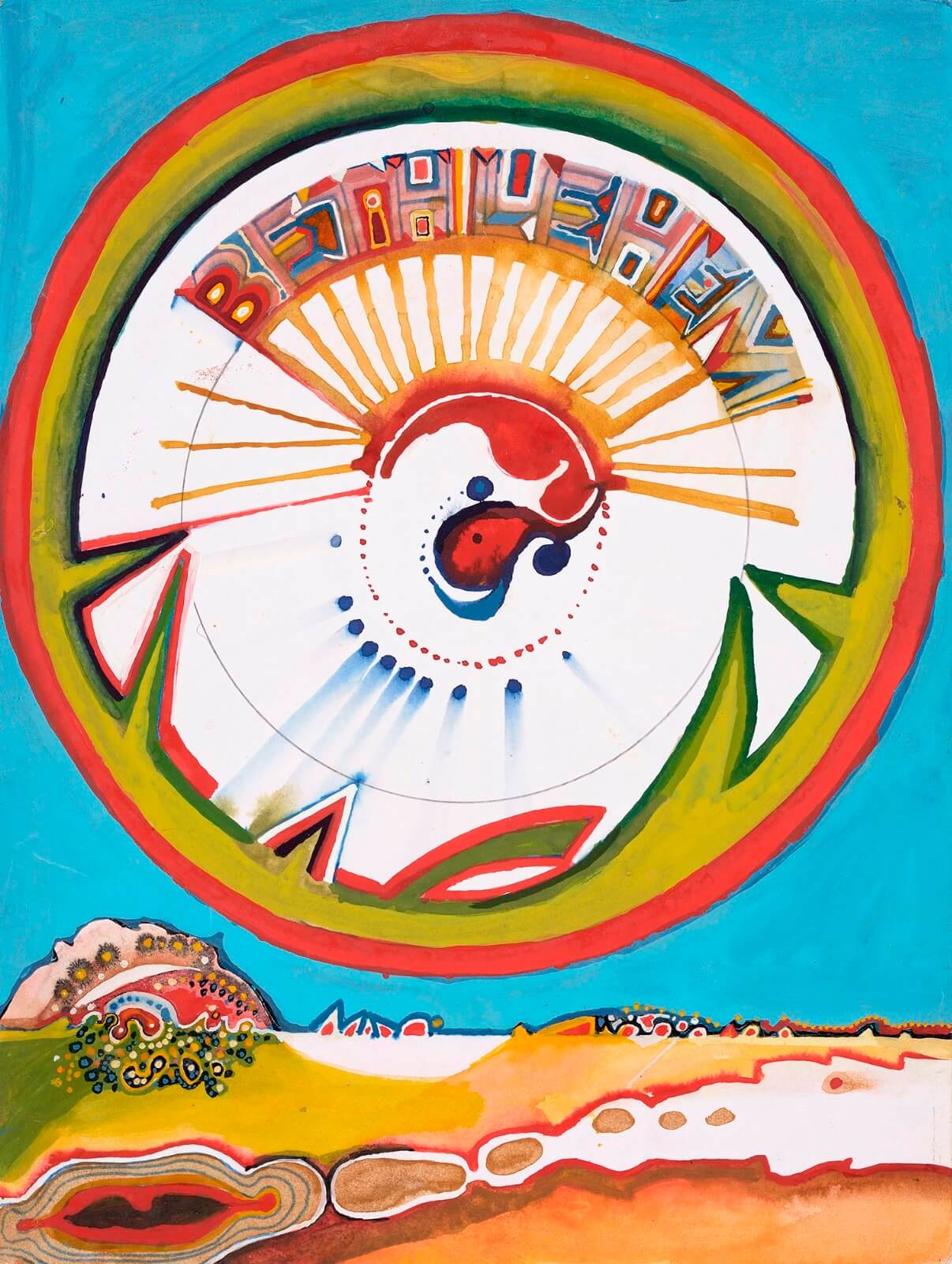 Evans’ strikingly large watercolours (they typically measure over one metre in height or breadth), span two decades, (from the late 1960s to the late 1980s). While powerfully evoking the period charm of the glam-rock era, Evans showed a conscious awareness of the shifting political landscape around him. His compositions are characterised by a kaleidoscopic vision of Thatcher’s Britain: an era of urban redevelopment, the Falklands War, industrial unrest, nuclear power, and the Cold War. Transition is everywhere: new roads carve their way through the countryside; fighter jets cast their shadows across the landscape; the scars left by industrial plants, pylons and landfill permeate throughout.