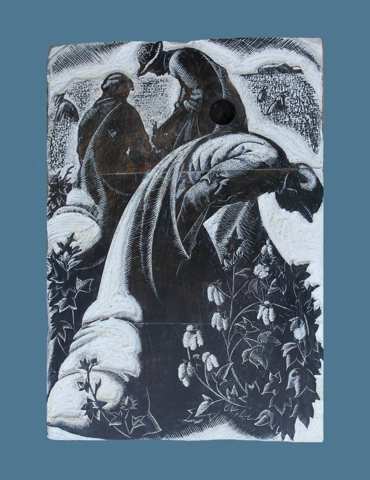 Cotton Pickers, edition of 110, was published in Elsie Syminton’s By Light of Sun, 1941 (commission for The Rochester Print Club), an account of establishing a garden in America by a transplanted Englishwoman. Leighton herself moved to America in 1939 and became a naturalised citizen in 1945.