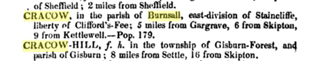 According to A Topographical Dictionary of Yorkshire, Cracow is a hamlet or a ‘gentlemen’s seat’ in the parish of Burnsall, Yorkshire.