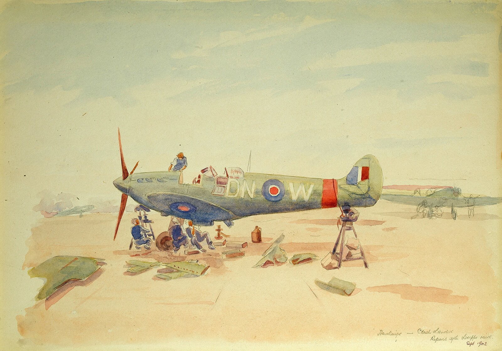 pitfires await the skilled attention of RAF mechanics. Wherever possible