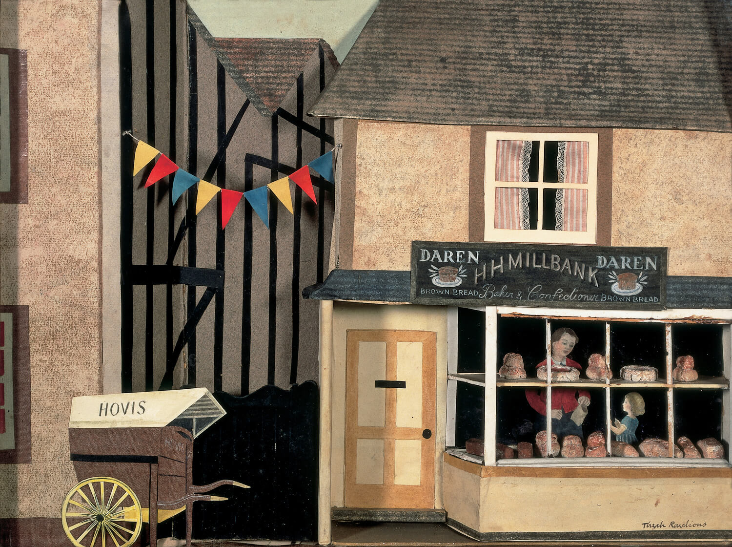 As a student, Garwood had excelled as a wood engraver. During her 30’s she began painting in oils, but also produced a series of captivating images of local Essex houses and shop fronts, (1944‚Äì1949). She soon developed her own distinctive style, where each one was lovingly recorded with a mixture of print and collage which she assembled and sometimes constructed into a 3D model in a shallow box frame.