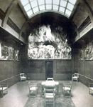 The Committee Luncheon Room, for Lloyd’s Register of Shipping, Fenchurch Street, London was decorated by Brangwyn from 1908-1914. The scheme comprised ten paintings in Tempera on canvas: 4 panels measuring 137.2×121.9cm (4ft 6inx4ft), 4 panels measuring 137.2×243.8cm (4ft 6in x8ft), 2 panels measuring 137.2vx91.4cm (4ft 6vinx3ft).