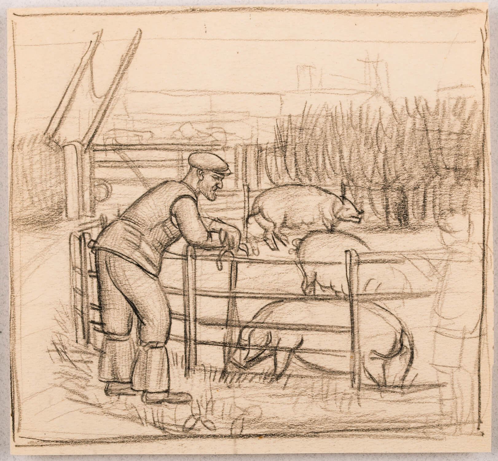 Farmer leaning on a fence tending pigs, circa 1925