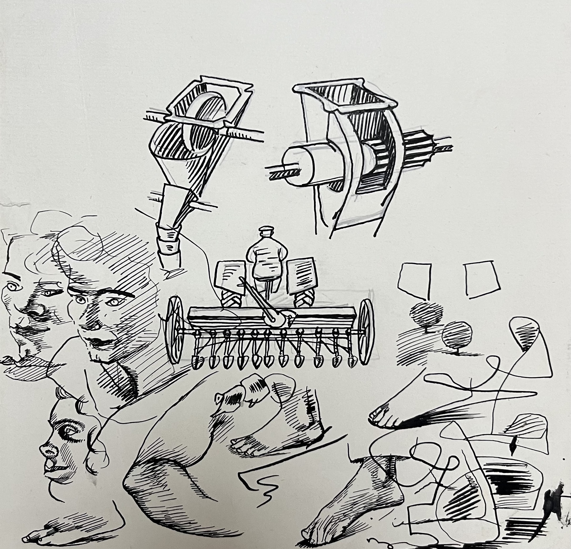 As is usual with Dunbar, any piece of paper in her studio might serve for a variety of subjects: here, among some grotesqueries and portrait sketches, there are detailed and carefully drawn images of two types of force-feed drill (above) and a horse-drawn harrow (below).