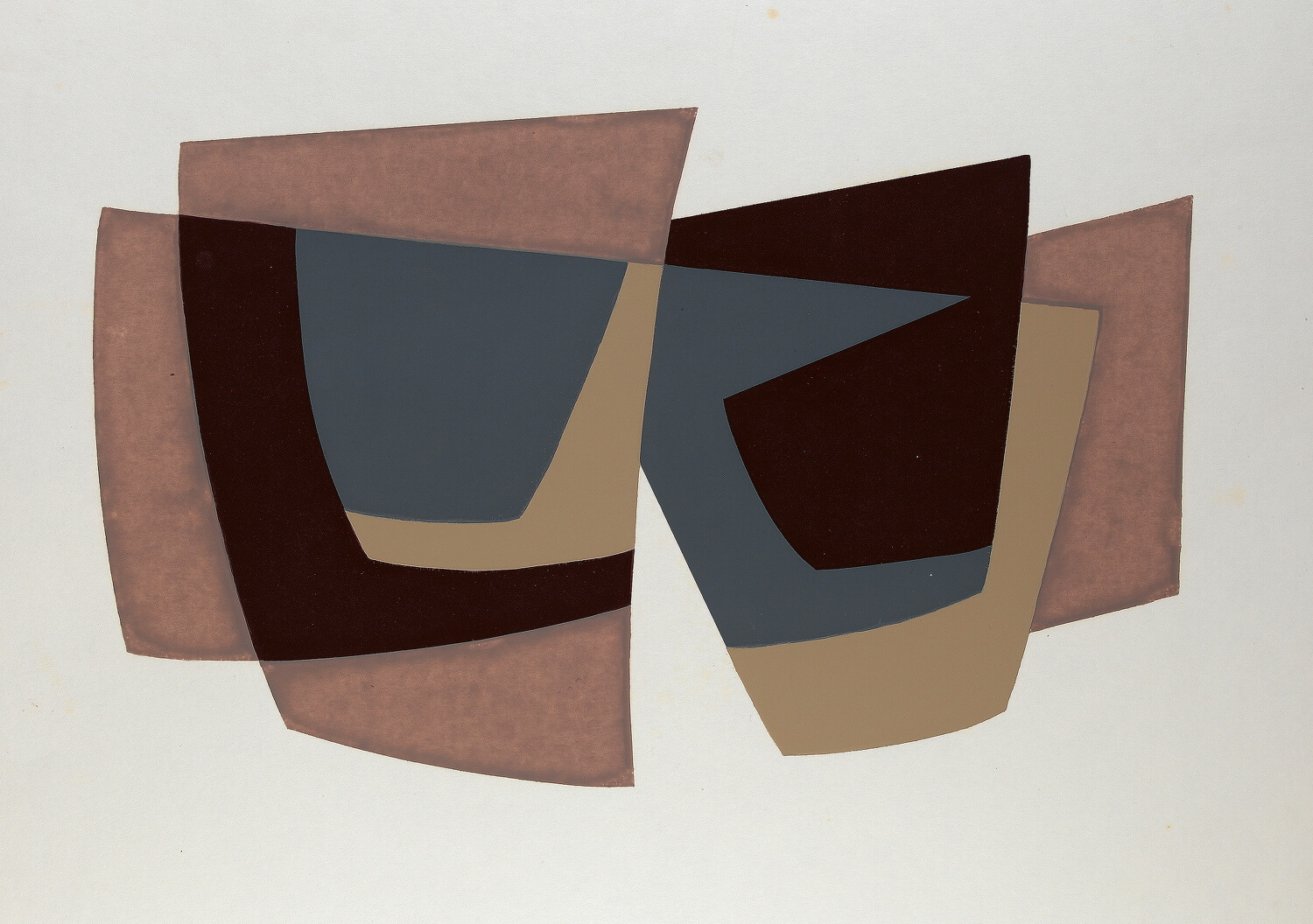 In the 1970’s Guthrie embarked on a series of bold abstract paintings and silk screen prints which she referred to as her “Camelot” series. Although the prints were usually preceeded by oils or collage with gouache the Camelot series evolved mostly around the possibilities offered by silkscreen printing where layers of pure colour could be laid over one and another without bleeding or distortion. Guthrie was introduced to the technique of silk screen printing as early as 1954, by Linnet Guthrie, the daughter of her first husband Robin – by the early 1970’s she had mastered the art and become one of the most accomplished practioners of any generation. Her early prints, like her paintings of the period, where semi abstract stylized decorative conversation pieces, such as The Pram (1954) or Two under one hat (1954). At the beginning of the 1960’s, after her husband Cecil Stephenson suffered a stroke and was no longer able to paint, Guthrie launched into pure abstract painting. From the textured, soft edged and muted palette of the 1960’s she progressed towards a hard geometric style which was increasingly inspired by her husband’s work. She used the medium of silk screen printing both to reproduce some of the iconic abstracts of Stephenson from the 1930’s (From a painting in Egg Tempera by Cecil Stephenson, 1936) through to abstract reproducing compositions with daring colour combinations of her own design, such as seen in the Camelot series. The silk screen prints are almost always most successful than the large oil paintings which preceeded them.