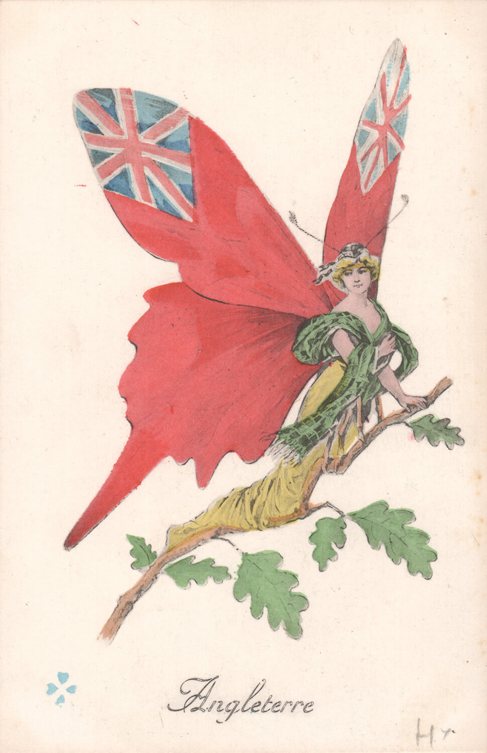 Printed by Editions “Aux AlliĆ©s” Paris this postcard was one in a series of fourteen cards depicting the allies as butterflies and the enemy as beetles or wasps: these comprise Angleterre, France, Belgique, Italie, Serbie, Montenegro, Roumanie, Russie, Japon, Allemagne, Autriche, Turquie & Bulgarie and Amerique., (Amerique not being printed till 1917 or 1918).