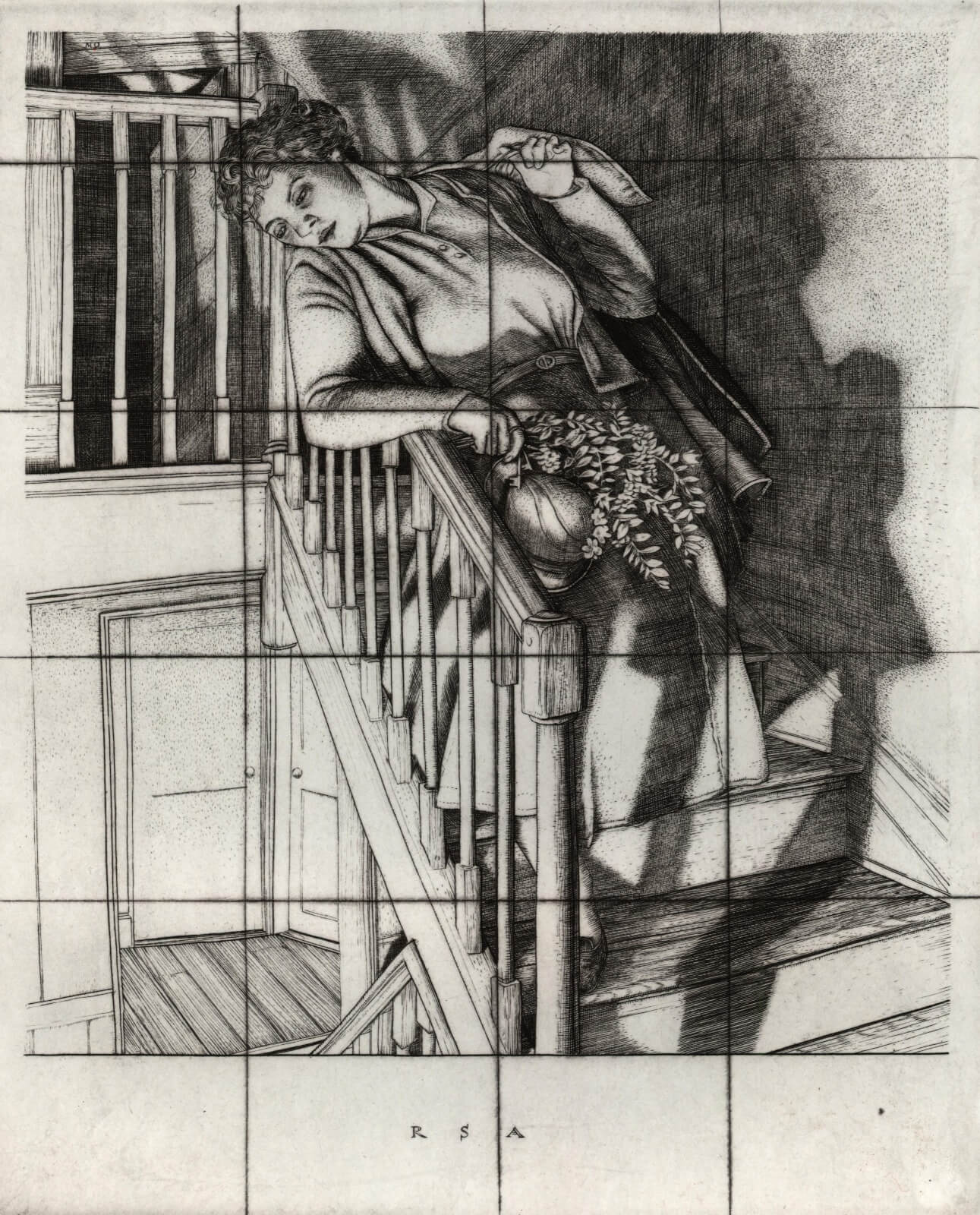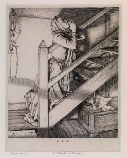 One of Austin’s signature prints Girl on a Stairs might be seen as a pendant to the same sized image Evening which Austin produced in the early years of WW2.  Both compositions, which evolve around  solitary figures in at the bottom and top of a stair case, enveloped by shadows and silence,  convey a  sense of mystery.  The setting of Evening was  The Chapel at Burham Overy Staithe, (Norfolk) where Austin had his studio when not working in London.  This is probably also the setting for Girl on Stairs