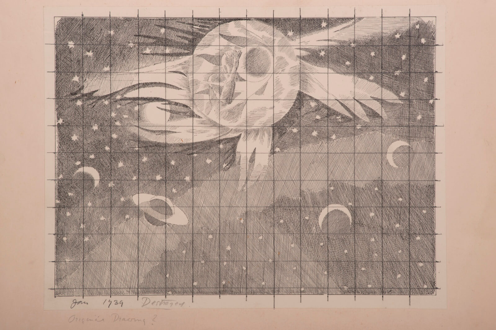 In 1934, Gilbert Spencer was offered a commission from Bob Gathorne-Hardy at the Mill House Press to illustrate The Ten Commandments, a comprehensive and complicated subject that the artist savoured. ‘It was just the kind of employment I was wanting’, he wrote, ‘giving me a subject, scope, and discipline. I had to submit it for approval but there was not this time that tiresome question as to whether the drawing is like the sitter. Instead there could be discussion of a more interesting and varied kind.’ Back home in Cookham, after completing his paintings for the Oratory in Burghclere, Stanley quipped, ‘Gil has found the Commandments all broken in the Bible’. Indeed he had, and then set to joining them back together. Unlike many of his contemporaries and teaching colleagues who readily enjoyed acclaim as illustrators, Gilbert had relatively little experience. However, he thrived on the challenge, creating a folio of 11 large drawings (and two title page illustrations) brimming with visual incident and character, each drawn with a tight linearity, economy of expression and little waste. Gilbert’s characteristically controlled cross-hatched shading lent itself well to the lithographic process and the portfolio of large ‘tipped in’ prints on smooth woven cream paper were considered by both artist and publisher a success.