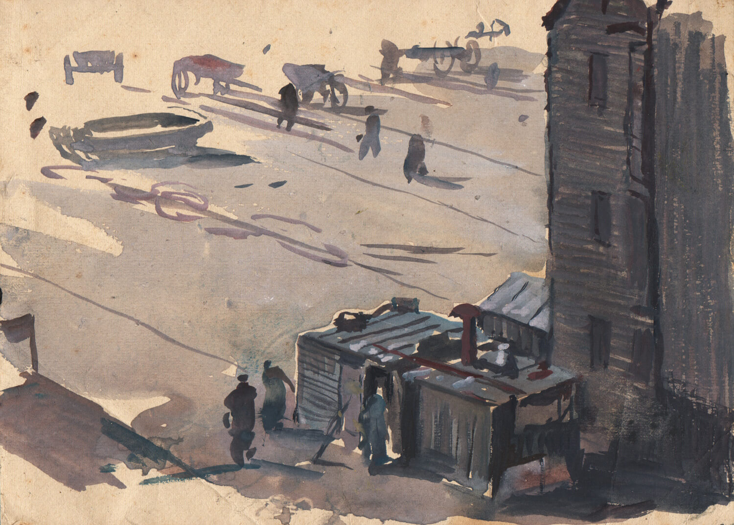 His technical facility – especially when working on large panoramic canvases – was remarkable. His pictures are rich with texture, light and movement. He was equally at ease with aerial views, landscapes, seascapes and cityscapes, and was a master of crowd scenes. His work as an Official War Artist has never received the attention it merits.