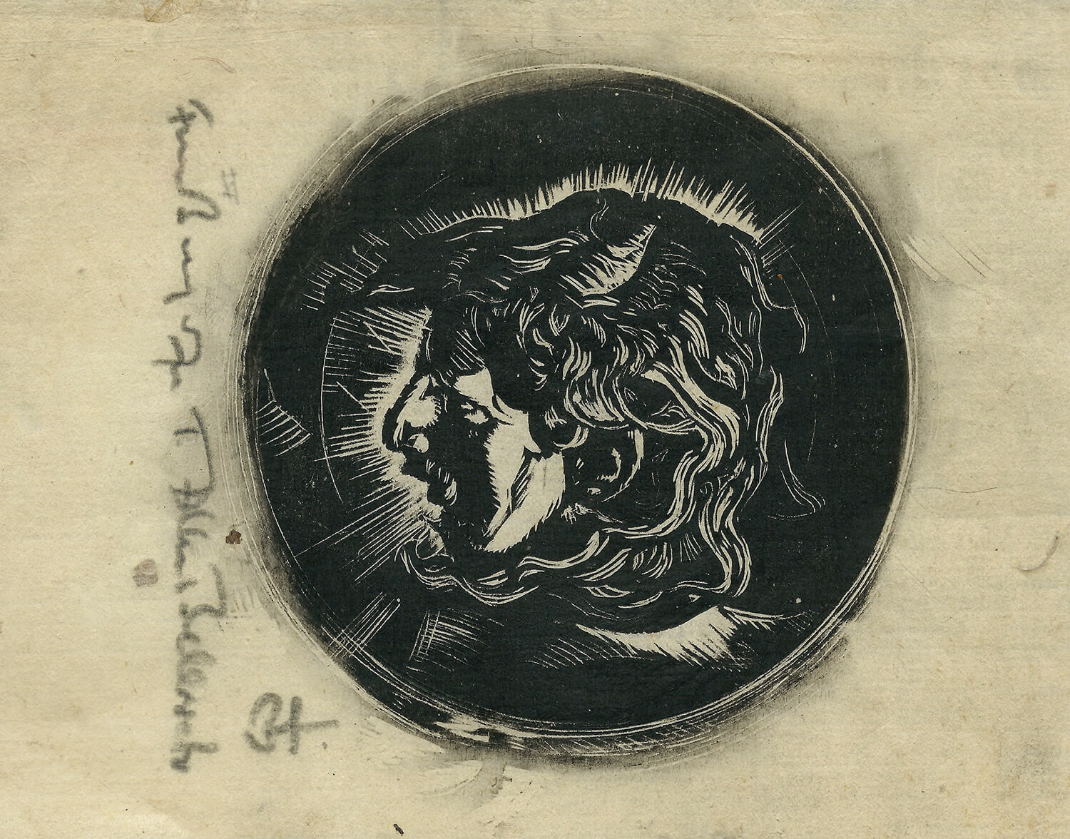 This circular woodcut, was inspired by Brangwyn’s 9th Station, ​(​Jesus falls for 3rd time ​)​ in which Christ is portrayed in a similar profile portrait with long wavy hair set against a starburst backdrop. ​William de Belleroche assisted Brangwyn in the production of these woodcuts.
