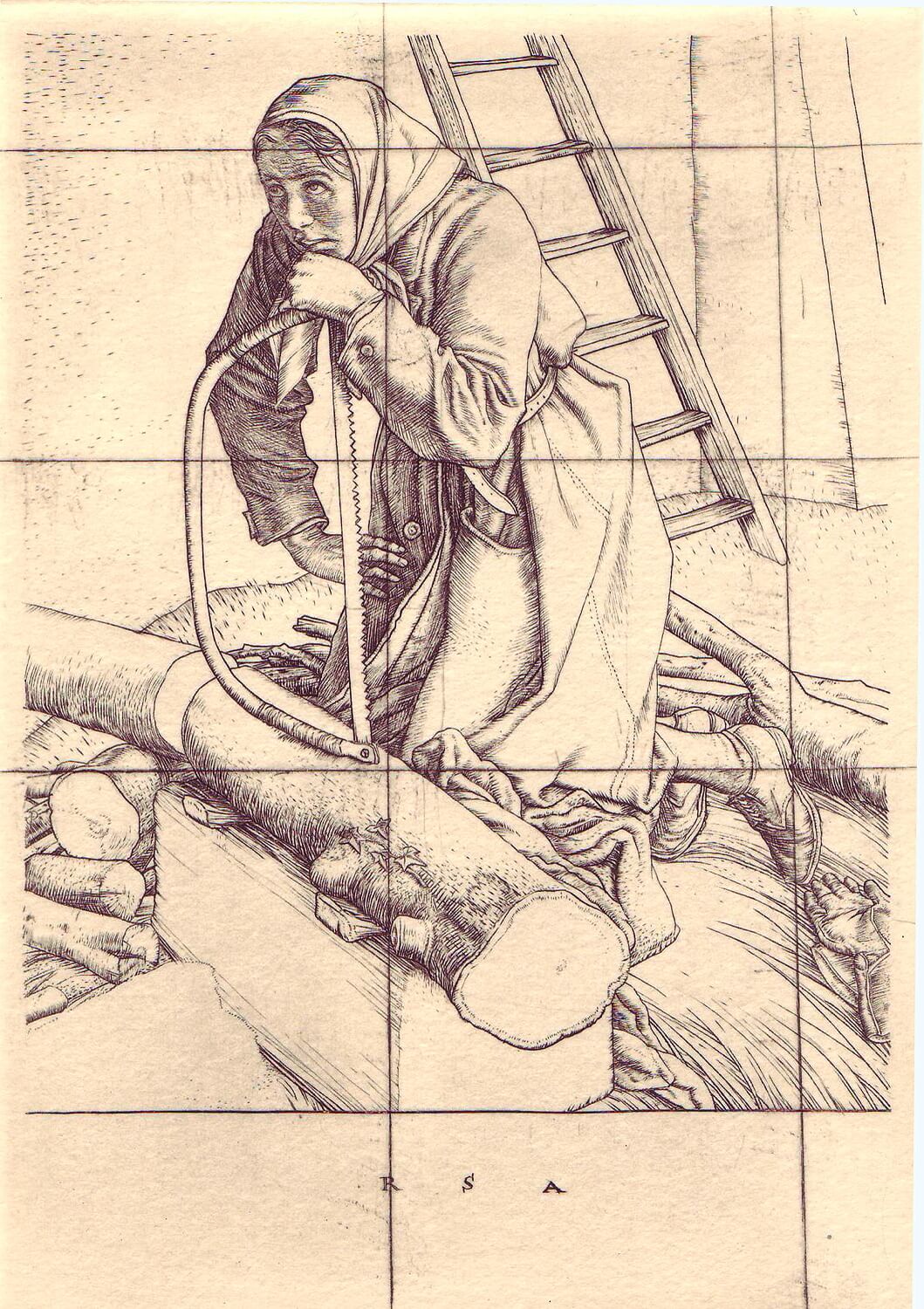 The subject of this meticulously handled image is evident in the title – hundreds of thousands of women were widowed during the Second World War.  This engraving was made after the publication of Campbell Dodgson’s catalogue on the engraved works of Robert Sargent Austin and has been listed variously under the titles of Woman with Saw, Widow of a Hero and Hero’s Widow – it was under this last title that the plate was issued as the presentation plate of the Print Collectors’ Club at the end of 1944.