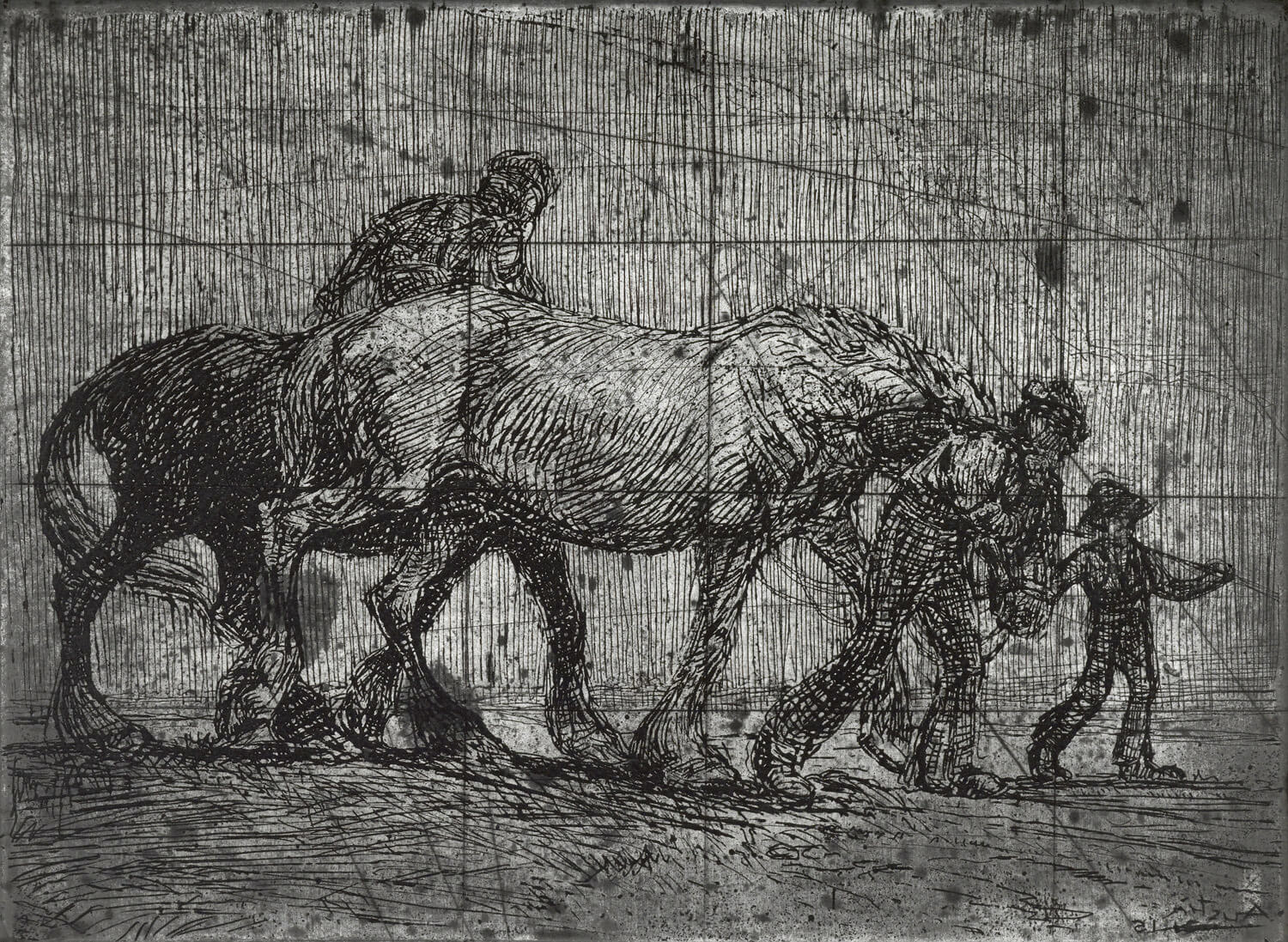 Horses were a favourite subject of Austin’s, especially early in his career.  This original plate, the print of which is either  extremely scarce  and more likely was never editioned, is possible the very first recorded example of a etching by Austin.  The image has much in common with Austin’s slightly later The Trace Horse (1921) and The Horse of Ostend, (1922), though stylistically owes more to Edmund Blampied